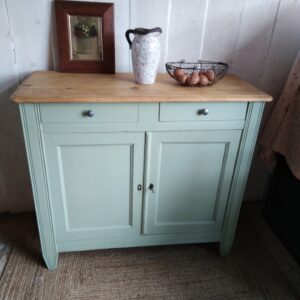 Buffet campagne chic avec une grande capacité de rangement , il a été entièrement décapé, poncé, traité contre les parasites du bois et repeint avec le « crème » de chez Liberon. Une très ancienne targette de fer blanc ainsi qu’une très belle plaque émaillée finalisent le tout.
